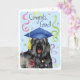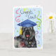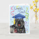 Herzlichen Glückwunsch an Ihren Lieblings-Absolvent mit einem Geschenk mit einem niedlichen, glücklichen Bouvier des Flandres-Absolvent mit einem Mörtel inmitten einer Flasche Konfetti.