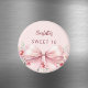 A blush pink colored background. Decorated with a large pink bow and pink flowers. Personalize and add a name. Black handwritten style script.