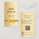 Ein Imitat goldener Hintergrund. Mit einem goldenen Bogen dekoriert. Personalisieren Sie Ihren Namen, Ihren Titel und Ihre Kontaktinformationen und fügen Sie diese hinzu. Fügen Sie Ihre Website url/link zum Qr-Code hinzu. Mit Facebook und Instagram Icons. Schwarzer Text.