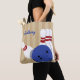Erstellen Sie ein personalisiertes Geschenk für Ihren Lieblings-Bowler, wenn Sie ihren Namen zu dieser Tote-Tasche hinzufügen. Die Vordertasche hat eine realistische Abbildung eines Bowlingkugel und Bowling Buttone Set vor einem bräunlich gestreiften Hintergrund mit einem Spot, um einen Namen in blauen Schriftzeichen hinzufügen. Auf der Rückseite befinden sich koordinierende Bowling-Designabbildungen.
