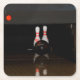 Ein Drink-Untersetzer zeigt ein Bild von zwei Bowling-Buttonen, die kurz davor stehen, von einem Bowlingball zum Reservat niedergeschlagen zu werden.