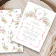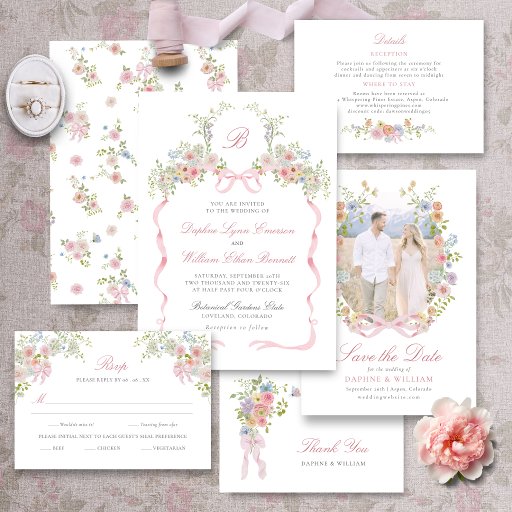 Bows and Wildflowers Wedding Invitation. This wedding invitation features a romantic monogrammed design framed by soft watercolor wildflowers and flowing pink ribbon bows. Delicate floral garlands and graceful greenery evoke the charm of a Victorian English garden, creating an elegant and timeless first impression. The overall look feels refined, romantic, and perfectly suited for a classic floral wedding.