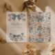 Coquette Bugmode Baby Dusche Einladungskarte mit handgezeichneter Abbildung von Bändern und Blume in blauen Farben.