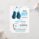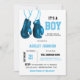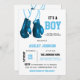 Super unique boxing (box) thème de la carte d'invitation pour la douche bébé. Arrière - plan blanc avec gants en bleu. Deux couleurs différentes, bleu et blanc. Cartes modèles modifiables pour ajouter vos informations. Obtenez des autocollants assortis pour vos faveurs cadeaux.