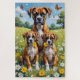 Eine fröhliche Boxerfamilienszene in einer sonnigen Gänseblümchenwiese. Mit einem spielerischen erwachsenen Hund und zwei niedlichen Welpen fängt dieses Kunstwerk Energie, Wärme und Glück ein – perfekt für Hundeliebhaber und helle Wohnraumdekoration.