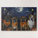 Entfesseln Sie den unheimlichen Geist mit diesem unheimlichen Halloween-Design, das eine Hundepackung unter einem dunklen, mondbeleuchteten Himmel bietet, umgeben von fliegenden Fledermäusen und glühenden Kürbissen. Ideal für diejenigen, die mit ihren wütenden Freunden eine Touch voller Furcht Liebe haben!