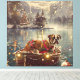 Set segelt mit dieser sehr detaillierten Abbildung in den Zauber der Urlaubssaison und zeigt einen stolzen Hund, der in einem festlich dekorierten Boot sitzt und über einen ruhigen Weihnachtssee gleitet. Die Lichter der nahen Kiefernbäume reflektieren das Wasser und warmen, festlichen Glanz, der das gemütliche Ambiente verstärkt. Die Ornamente versetzen sich von den Seiten des Bootes, während die Laternen leuchten und eine Szene schaffen, die das wahre Wesen der Weihnachtswärme und -freude einfängt. Dieses nostalgische Kunstwerk bringt eine Touch von Urlaubsmagie in jeden Raum, perfekt für diejenigen, die den Geist der Saison schätzen.