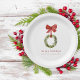 Minimalistische Teller aus Rotbogen-Boxholz-Weihnachtskreide. Diese Weihnachtsfeier mit Party bietet einen rustikalen Boxholzgrün und Weihnachtskranz mit rotem Bogen. Jeder Text kann mit jedem beliebigen Text Ihrer Wahl angepasst werden.