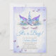 Es ist eine Boy Baby Dusche - lila und blaue Ohren und blaues Horn , schlampige violette Wimpern umgeben von funkelnd blauen violetten Herzen mit einem schön bemalten blauen und violetten Blumenspray auf der Stirn - Aquarellfarben Hintergrund vorne und hinten, leicht zu gestalten, das Detail dieser schönen Fantasie Unicorn Baby Shower Invitation. Original Artwork by © Whimsical Artwork™