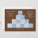 Cette jolie invitation au baby shower garçon est conçue avec des blocs de bébé bleus et blancs — certains ont des motifs à l'intérieur et d'autres épellent les mots "BABY SHOWER". Les blocs sont présentés sur un arrière - plan marron chocolat, ainsi que les détails de l'invitation qui apparaissent en blanc et le nom de la mère, qui apparaît en bleu. Copyright henishouseo