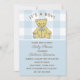 Die Blautdusche lädt zu einem süßen Bären ein, der einen blauen Bogen trägt und hinter dem ein blaues und weißes Büffel-Karo-Muster steht. Im Text oben steht: "Es ist ein Junge!" Der untere Teil der Karte ist blau mit Beispieldetails für das Party, damit Sie Ihre persönlichen Daten anpassen können. Die Rückseite der Einladung ist mit dem Blau-Weiß-Büffel-Karo dekoriert.