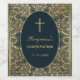 Dieses elegante, Vintage Dekorationsdesign mit einem Vintagen goldenen Rahmen mit spiralförmigen goldenen Blätter auf dunkelmarineblau-blauem Hintergrund. Der Text ist in einem Oval mit goldener Grenze und hat darüber ein goldenes Kreuz. Der Name des Jungen ist in einem eleganten kalligrafischen Skript geschrieben. Der gesamte Text kann personalisiert sein und hat eine goldene Farbe, die den goldenen Verzierungen des Rahmens ähnelt. Auf der Rückseite sind die gleichen goldenen Blätter dekoriert und ein kleineres Oval mit einem goldenen Kreuz in der Mitte. Der Hintergrund mit seinen eleganten goldenen Blätter Dekorationen auf marineblau stammt aus einer Vintagen Buchcover-Bindung von T. J. Cobden-Sanderson (1840-1922) für The Hauptstadt von Karl Marx; erschienen 1884, jetzt öffentlich zugänglich. Das Buch gehörte dem Künstler William Morris.