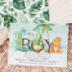Dinosaurier Thema Baby Dusche Einladung mit drei Dinosauriern. Die Rückseite der Einladung hat ein tropisches Vegetationsmuster.