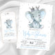 Junge Elefant Babydusche Einladung mit bezauberndem Babyelefant mit hübscher silberner Krone auf silberfarbenem Glitzer. Diese Elefanten Baby Dusche Einladung ist einfach für Ihre Veranstaltung angepasst. Sie können den Hintergrund des rückseitigen Glitzer entfernen und die gewünschte Farbe hinzufügen.