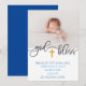 Diese süße Geburtsankündigung beinhaltet ein Single-Foto an der Spitze und eine Geburtsinformation am unteren Ende. In der Mitte des Designs steht Text, der "Gott segne" mit einem simulierten Goldkreuz sagt.