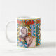Hunde Liebe klassische Musik. In einigen Tierheimen schlafen die Hunde jeden Abend mit den beruhigenden Klängen klassischer Musik. Wenn die Musik beginnt, hören sie alle auf zu bellen und lassen sich zu süßen Träumen nieder. Die Entwürfe in dieser "Hunde-Liebe-Klassik"-Serie feiern die intuitive Verbindung zwischen Hunden und dieser wunderbaren Musik. Das Originalwerk von ZoeSPEAK auf dieser Tasse zeigt ein Portrait des Komponisten Johannes Brahms. Das Portrait ist in einem verzierten vergoldeten Rahmen, auf einem hellblauen Hintergrund mit rosa Streifen und pranzenden Schafen. Vor dem Foto eines Hundes, kommentiert (in Englisch und Französisch) und zeigt mit roten Pfeilen auf den Komponisten. Im Text steht "Brahms's Lullaby".