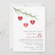 Un faire-part de mariage simple comportant une illustration de trois coeurs rouges pendant de la branche d'un arbre à feuillage persistant. Personnalisez avec vos initiales. Personnalisez la droite des textes en bas. Le bord opposé est vide.