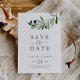 Cette branche d'olivier moderne, à l'exception de la carte datant, est parfaite pour un mariage boho. Le design rustique et élégant présente des feuilles botaniques et des olives noires d'aquarelle simple sur une petite branche à l'atmosphère méditerranéenne classique.