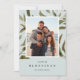Elégant carte photo de vacances botanique met votre photo de famille préférée sur un arrière - plan de feuilles peints à la main vert et marron, sur un arrière - plan vert sauge pâle. Personnalisez avec vos noms ou votre nom de famille sous un message de Noël ("bénédictions de comptage") en lettres élégantes et classiques. Ajoutez trois photos supplémentaires au revers sur un arrière - plan vert chasseur contrastant, avec l'année.