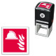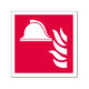 Feuerwehrhelm und Flammensymbol auf rotem Hintergrund.