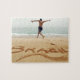 COPYRIGHT Stephanie Rabemiafara / DanitaDelimont.com| AF36 SRA0000.jpg| BRASILIEN. Barechest Mann mit einem Anzug, der auf dem Sand sprang, über den Namen Brasilien im Sand geschrieben, Springen in Richtung Meer