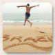 COPYRIGHT Stephanie Rabemiafara / DanitaDelimont.com| AF36 SRA0000.jpg| BRASILIEN. Barechest Mann mit einem Anzug, der auf dem Sand sprang, über den Namen Brasilien im Sand geschrieben, Springen in Richtung Meer