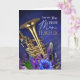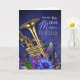 This card features a deep indigo-blue background with music notation subtly layered behind, creating a rich and immersive musical atmosphere. The message “You are the Best Music Teacher” appears in an elegant mix of white handwritten script and bold gold serif typography. A shiny brass trumpet dominates the left side of the card, adding brilliance and character. At the bottom, vivid blue, lilac, and purple flowers bloom beautifully, giving the design a celebratory and appreciative feel. This greeting card is ideal for music teachers, band instructors, brass instrument tutors, school music educators, orchestra conductors, choir directors, music coaches, and anyone who teaches music with passion.