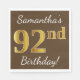 Dieses einfache Papier-Serviettendesign enthält eine Nachricht wie "Samanthas 92. Geburtstag!", mit dem "92.", das ein Imitat goldähnlich auf braunem Hintergrund zeigt. Der Name kann personalisiert sein. Es könnte auf einer Geburtstagsfeier für jemanden verwendet werden, der seinen zweiundneunzig Geburtstag feiert. [~Z0000082]