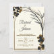 Eine Schwarz-Weiß-Hochzeitseinladung mit braunen und schwarzen Blume auf weißem Hintergrund. Die Einladung enthält die Namen der Braut und des Bräutigams, Richard und Juliana, sowie Datum, Uhrzeit und Ort der Hochzeit.