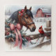 Farm thematisches Weihnachtspuzzle mit einem hübschen braunen Pferd mit einem roten Bogen und einem hübschen roten Kardinal auf dem Zaun mit einer rustikalen Scheune im Hintergrund einer schneebedeckten Aquarellkunst.