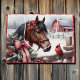 Bewirtschaftete Weihnachtsgeschenktüte mit einem hübschen braunen Pferd mit rotem Bogen und einem hübschen roten Kardinal auf dem Zaun mit einer rustikalen Scheune im Hintergrund einer schneebedeckten Aquarellkunst.