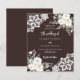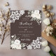 Für eine elegante und romantische Hochzeit. Brauner, bisterfarbener Hintergrund mit weißen Blumen, Rose und weißen Spitzen. Personalisieren Sie Ihre Namen und Details und fügen Sie diese hinzu. 1 Blatt = 1 Einladung mit Druckkante bis Kante.