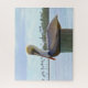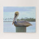 "Brown Pelican and Palm Trees" 16 x 20 von Catherine Sherman. Eine braune pelikanische Erholung auf einem Pfosten auf einem Pier in den Florida Keys. Im Hintergrund schweben eine amerikanische Flagge und eine Palmenreihe in der tropischen Brise.