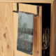 Küchentuch mit einem Foto eines braunen Pferdes mit einer langen weißen Kakermane. Stehend in einem Wald mit Schneeflocken, die überall herumfallen.