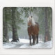 Mousepad mit einem Foto eines braunen Pferdes mit einer langen weißen, scheußlichen Mane. Stehend in einem Wald mit Schneeflocken, die überall herumfallen.