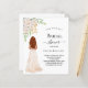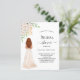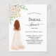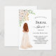Ein weißer Hintergrund. Eine Braut, weiße Blume und Grünpflanzen. Personalisieren und fügen Sie einen Namen und Party-Details hinzu. 1 Blatt = 1 Einladung mit Druckkante bis Kante.