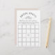 Behalt Gäste verlobt mit diesem modernen Brautparty Bingo Spiel! Mit einer schicken Hochzeitsring-Illustration und elegantem schwarzem Text auf Weiß mit sanftem Untergrund. Die Gäste füllen die Plätze mit vorhergesagten Geschenken aus und markieren sie, wenn die Braut ihre Geschenke öffnet - fünf in Folge gewinnt! Eine stilvolle und interaktive Art, die zukünftige Braut zu feiern. Vollständig anpassbar.