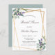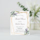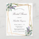 Ein stilvoller weißer Hintergrund auf der Vorderseite. Mit Eukalyptus und Lavendel-Blumen dekoriert. Ein Imitat goldener geometrischer Rahmen. Personalisieren und fügen Sie einen Namen und Details. Zurück: grüner grauer Hintergrund.