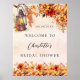 Ein Begrüßungspposter für ein Brautparty. Hintergrund mit rosafarbenem Farbverlauf. Vintage Laterne und orangefarbene Blume. Personalisieren und fügen Sie Datum und Namen hinzu.