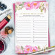 Brautparty Game Antwortkarte, personalisiert mit dem Namen der zukünftigen Braut oder der Braut und Bräutigam. Rosa Blumendesign mit Aquarellblüten und Blattwerk, Goldknospen und eleganter Kalligraphie. Ideal für alle Fragen und Ratings zu Hochzeiten oder Brautpartys mit nummerierten Zeilen, damit Ihre Gäste bis zu 20 Antworten zusammenfassen können.