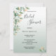 Im Vordergrund: Botanisches Thema. Farbverlauf grün, Hintergrund ombre. Grün, Grün und Blattwerk mit kleinen goldenen Blume. Moderne Großschrift, Typografie mit dem Text: Brautparty. Vorlagen für den Namen der Braut und die Einzelheiten des Party. Schwarzer Text. Zurück: grün gestufter Hintergrund.