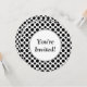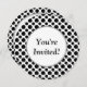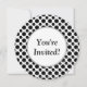 Eine kundenspezifische Braut- oder Babypartyeinladungsschablone mit den einfachen schwarzen Tupfen groß und klein auf einem weißen Hintergrund auf einer runden Einladung. Fertigen Sie sie zum Änderungs-Schriftart, Hintergrundfarben besonders an und mehr, retten sogar Ihren Entwurf für später.
