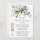 Die moderne Elegant Watercolor Botanical Greenery Bridal Shower Invitation Card beinhaltet Eukalyptus-Blätter, grünes botanisches Blattwerk, staubblaue Blätter und andere schöne botanische Pflanzen. Dusty Blue Back. Champagnerglas mit Dusty Blue Bow. Trendy Kalligrafie Script.
