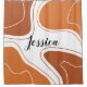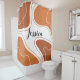 Personalisierter Duschvorhang mit modernen abstrakten geometrischen Formen in orangefarbenen Brauntönen und einem personalisierten Namensdruck in der Mitte.