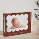 Einfache und moderne Geburtsankündigung Foto mit dem Foto Ihres Babys in einem braunen Skallopierrahmen eingebettet. Personalisieren Sie den Foto-Block, indem Sie den Namen Ihres Babys und zusätzliche Informationen in weißer Schrift hinzufügen.