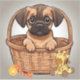 Brawn Tan Dackel Mops Welpe sitzend im Korb.