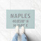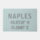 Stilvolle Eingangstüre mit den Koordinaten der italienischen Längen- und Breitenkarte Neapel im modernen grauen industriellen Schriftart auf hellblauem Hintergrund