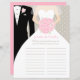 Eleganter Grafik-Bräutigam mit Tux und Braut mit Schleier mit einer Pose aus rosa Rose Blumenspiel-Brautparty. Editieren Sie dieses lustige Brautparty mit Ihrem Brautnamen und Ihrem Namen. Brautparty Party Gäste werden gebeten, so viele Wörter wie möglich aus dem Namen der Braut und Bräutigam zu erstellen und die Wörter, die sie in den Zeilen, die zur Verfügung gestellt werden, auszufüllen. Ein einfaches Spiel, das man gut als Eisbrecher verwenden kann. Einzigartiges Design und grafische Kunst von Sarah Trett.