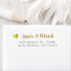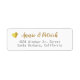 Ihre Zuhause-Adresse ist leicht personalisiert... auf einem weißen, klaren und sauberen Etikett mit zwei Textzeilen, zentriert ausgerichtet, und Braut- und Bräutigam-Namen, die in einem stilvollen Skript-Schriftart-Stil mit dem Bild eines kleinen Imitats goldenes Herz geschrieben sind