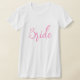 Der T - Shirt der Frauen wird in einem Crew-Hals und kurzen Ärmeln-Stil in Weiß mit rosa Text gezeigt: Braut. Passen Sie dieses Objekt an oder kaufen Sie, wie es ist.